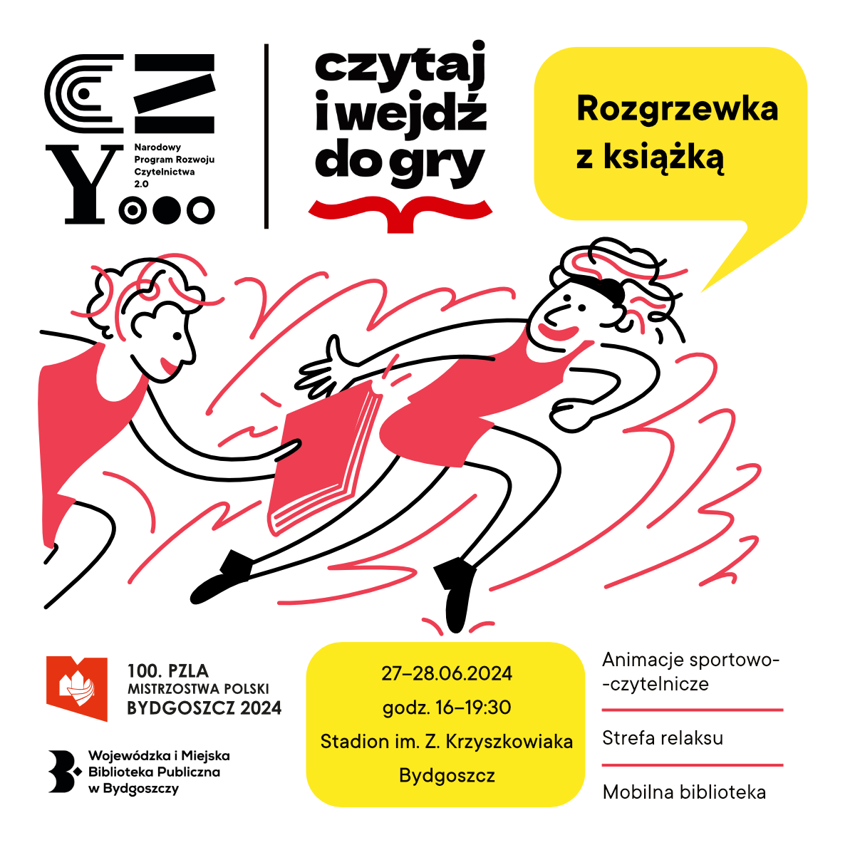 Królowa sportu z pewnością zapewni Wam niemałe emocje, a my pokażemy jak cenne, fajne i przyjemne jest czytanie książek. Wspólnie ze znakomitym zespołem Miejskiej Biblioteki Publicznej w Bydgoszczy przygotowaliśmy bogaty program w ramach akcji „Czytaj i wejdź do gry”. W czwartek i piątek, w godz. 16:00 – 19:30 w strefie NPRCz 2.0 znajdziecie m.in.: biblioteczkę z książkami dla dzieci, młodzieży i dorosłych, warsztaty i zabawy sportowo-czytelnicze – bieg